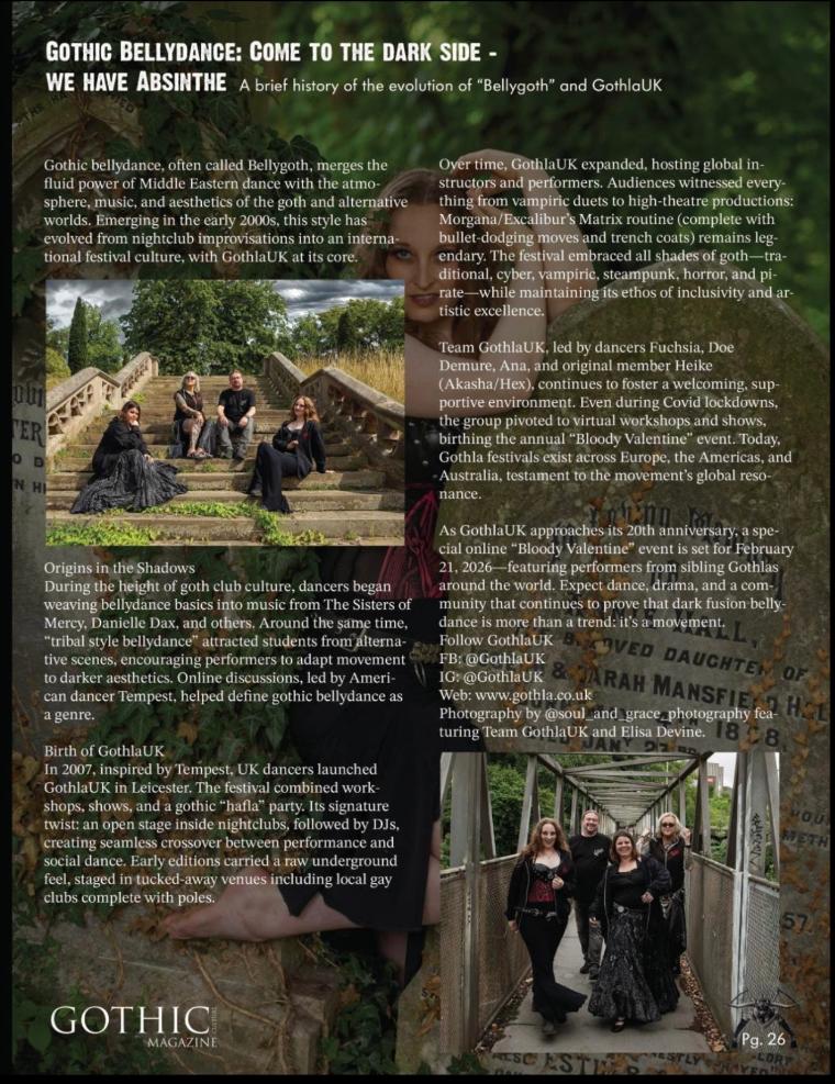 Gothic Culture Magazine. GothlaUK Gothic Bellydance feature, Page 26, Issue #60 September 2025. Models: Doe Demure (full page), and members of team GothlaUK (Akasha, Woz, Fuchsia, Doe Demure). Photography: Soul and Grace Photography